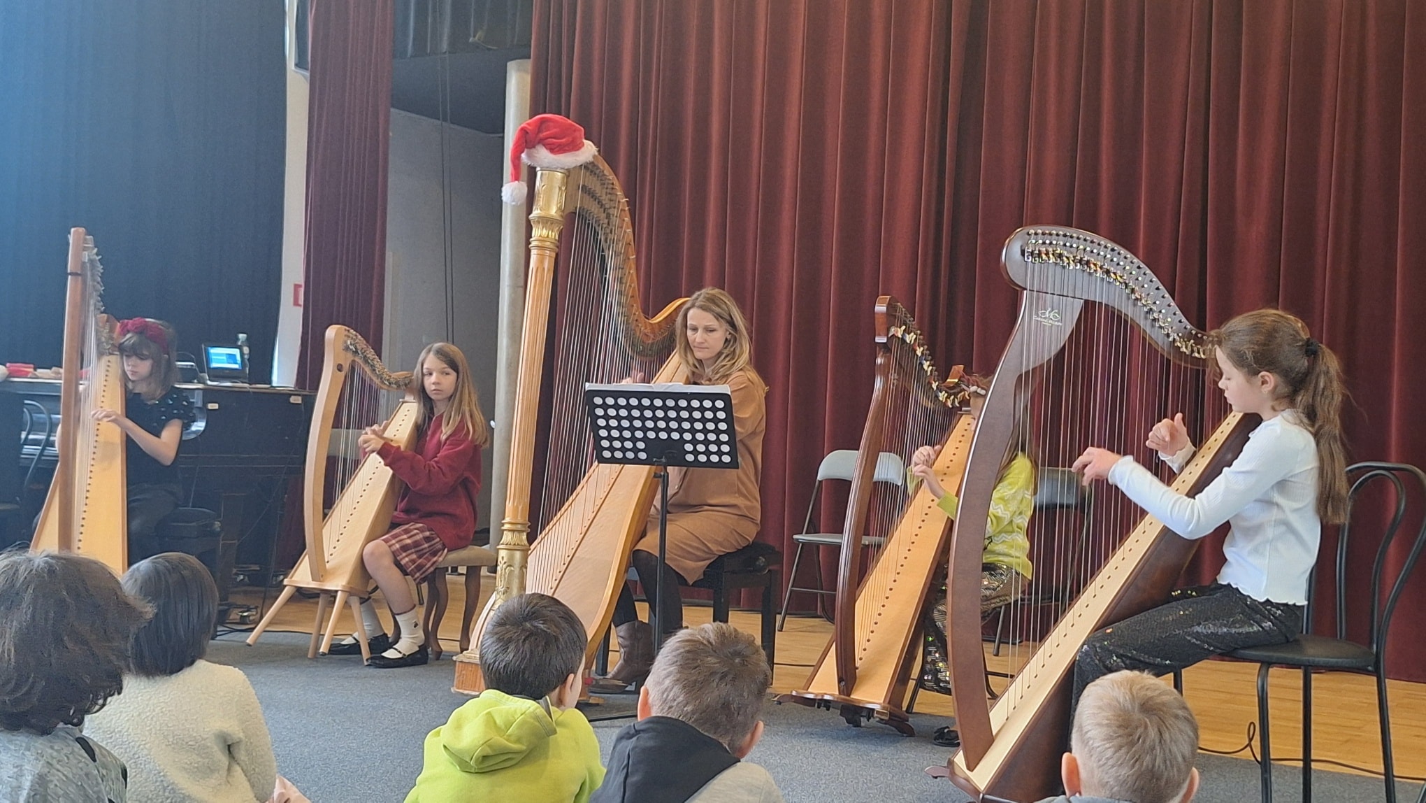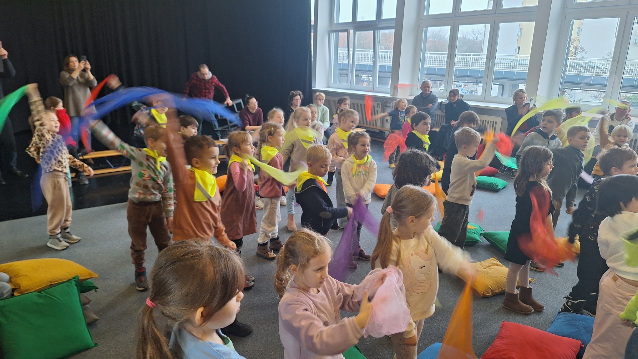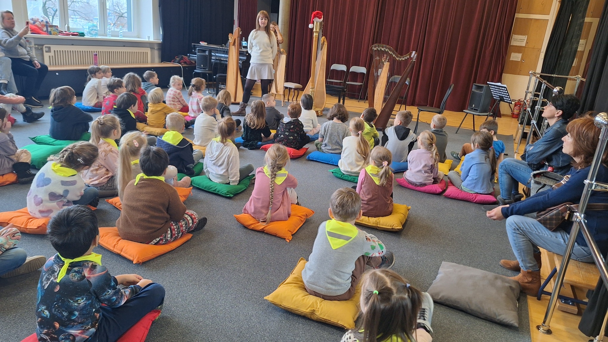 W grudniu dzieci z grupy "Bulinki" wybrały się do Młodzieżowego Domu Kultury przy ul. Łazienkowskiej na wyjątkowy interaktywny koncert Bożonarodzeniowy połączony z występem zespołu Fasolki. Podczas wydarzenia przedszkolaki miały okazję usłyszeć utwory w wykonaniu młodych artystek oraz wspólnie przeżywać muzyczne emocje. Dzięki prowadzeniu spotkania przez panią Adriannę z Filharmonii, koncert był nie tylko pięknym świątecznym widowiskiem, ale również cenną lekcją o instrumentach.