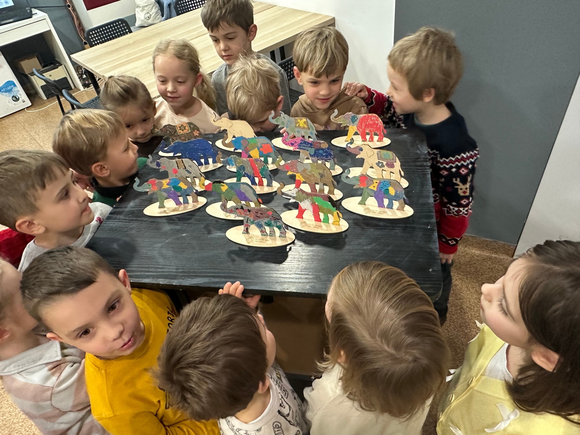 ​Na koniec zajęć dzieci zamieniły się w prawdziwych artystów i wzorując się na indyjskich mistrzach, pięknie ozdobiły własne figurki słoni. Kolorowe dzieła wróciły z nami do przedszkola i będą wspaniałą pamiątką z tej wyprawy!