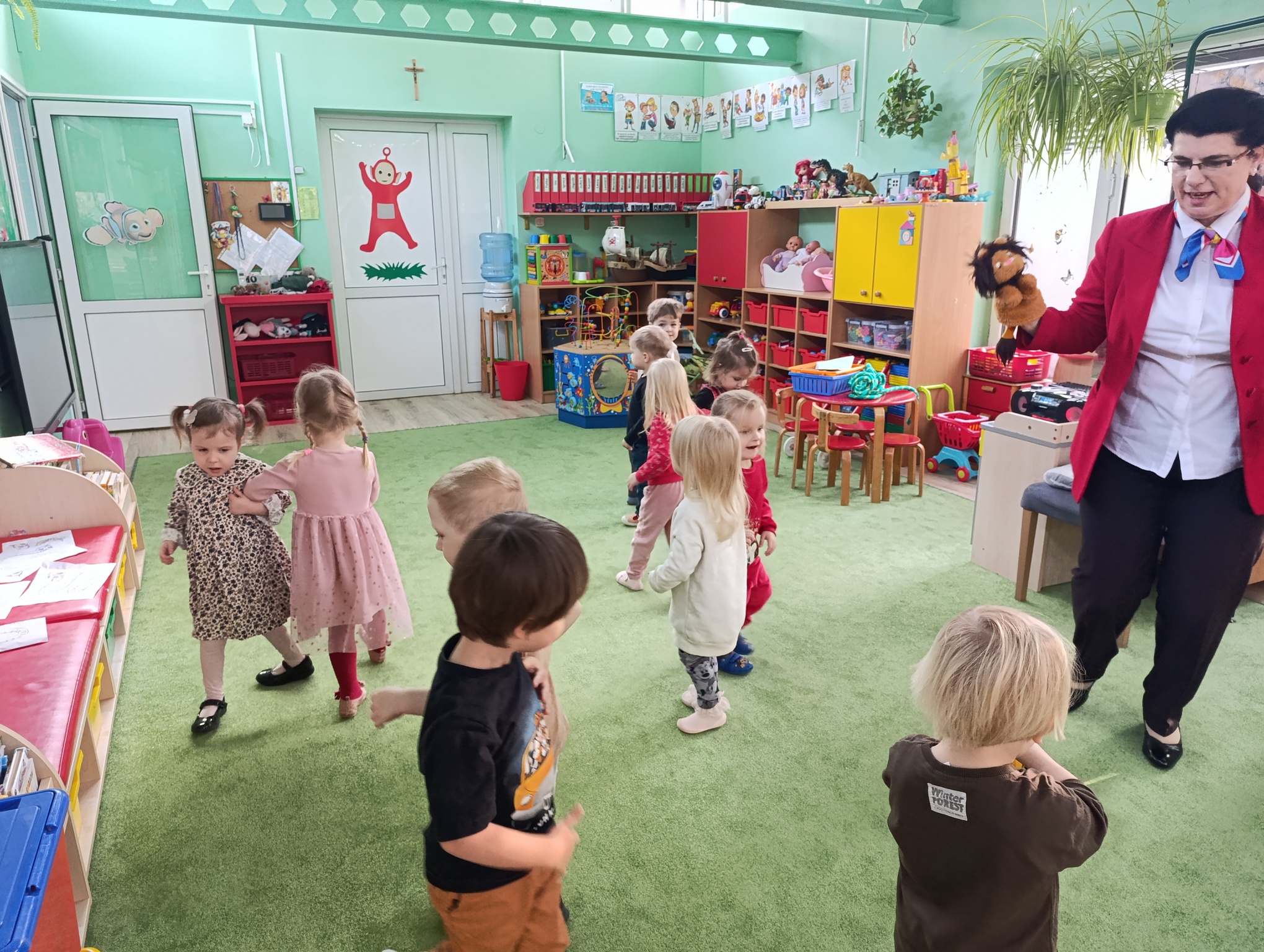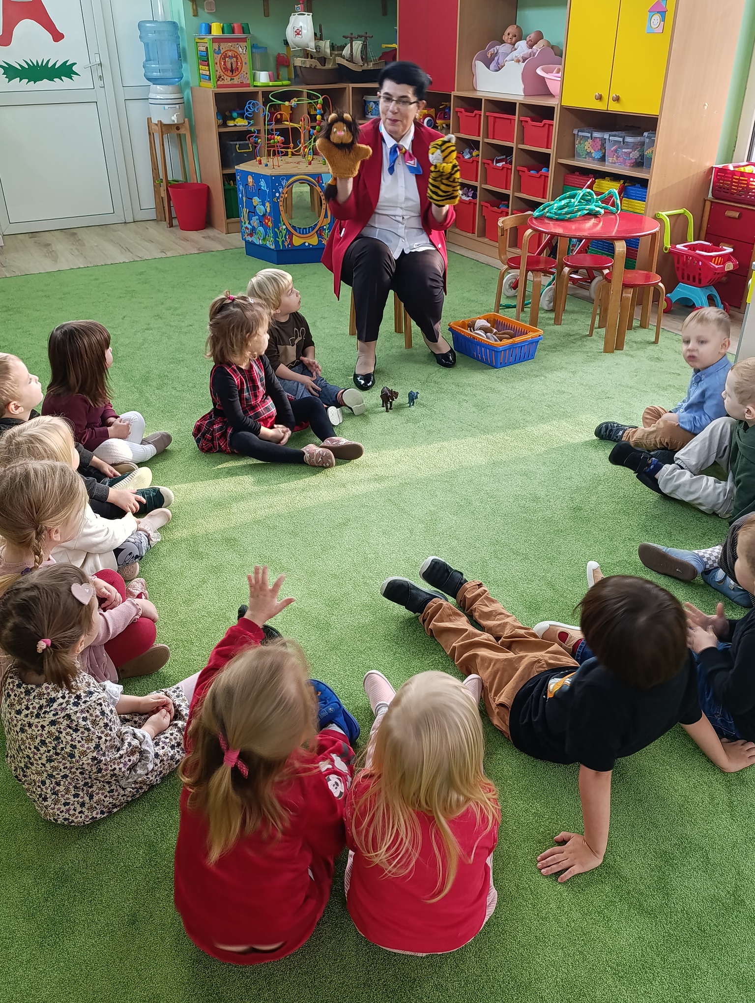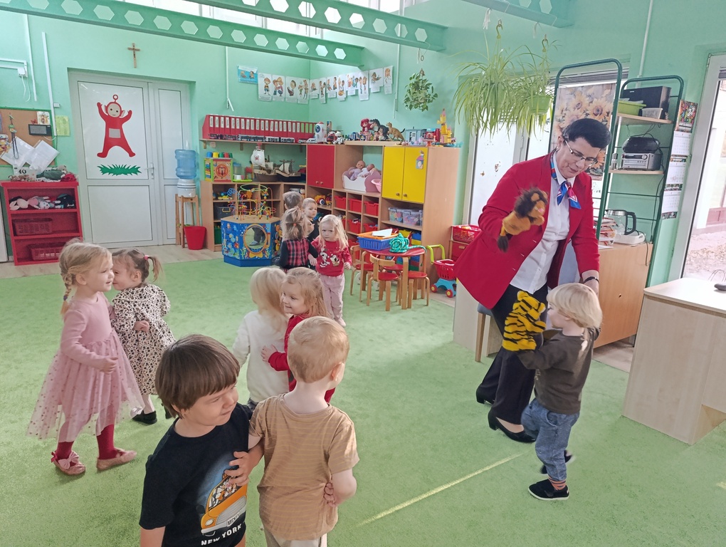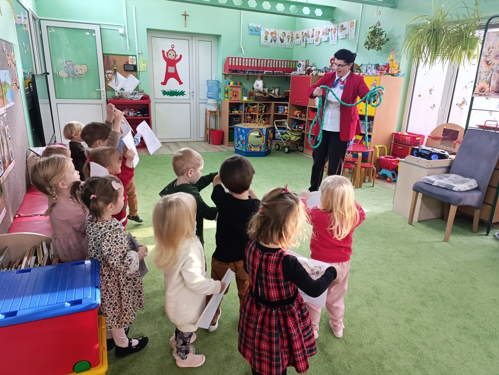 Maluszki na zajęciach z angielskiego, poprzez zabawę, poznawały zwierzęta egzotyczne.