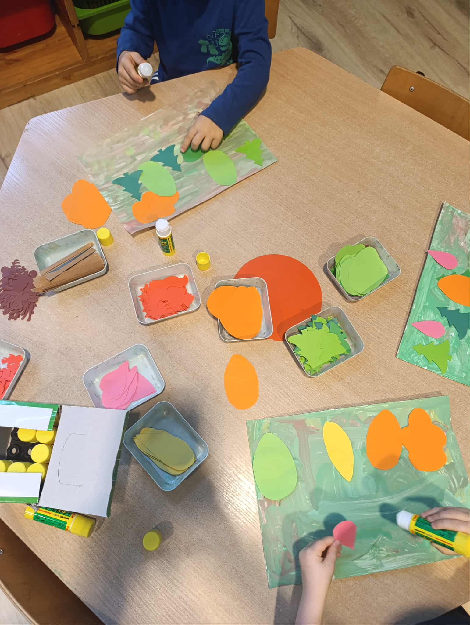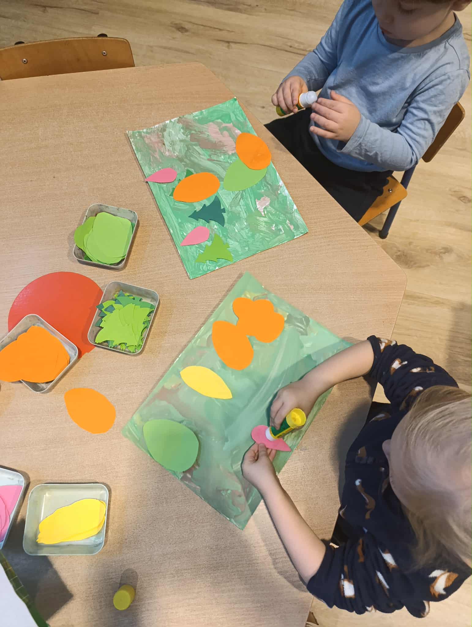 Jesienne zajęcia plastyczne dla maluszków, łączące malowanie i klejenie.